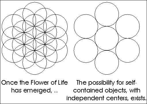 This only puts us on the threshold, however, or just barely reaching it, and not over it. Spirit had circumscribed–or encompassed–the arc of its first observation, at this point, by establishing the Seed of Life. It had also created six new vantage points, equal to, but distinctly different from the first, and this equality could be verified. On the other hand, at this point in the process the sense of distinct objects with separate centers was only half realized. Likewise, there was only a vague notion of size and proportion, with an open question of how many dimensions there might be and how many degrees of freedom there are. That is, Spirit had stretched itself out in six directions from the center, but knew only that these new points of view were equally distant from the origin and from those they touched. Spirit was still looking for answers and was unsure of what it had found. Did its first cycle of action imply (or define) a 2-d or 3-d space? There was no way of knowing. Though we usually see the Seed and the Flower of Life depicted as if they lie on a circle, the One Being did not know for sure. For example, if each circular figure within these forms is viewed as a sphere–instead of being forced to remain flat–we see that a variety of higher-dimensional objects can spring from the Seed and Flower of Life. These forms were yet to develop, however. Still, there was no way of knowing exactly how many dimensions there were, initially. In other words, coming from the realm of the zero-brane truly gives us no frame of reference; there is absolutely no way to tell what the real dimensions of reality are.