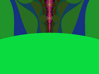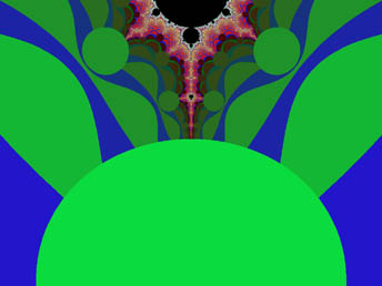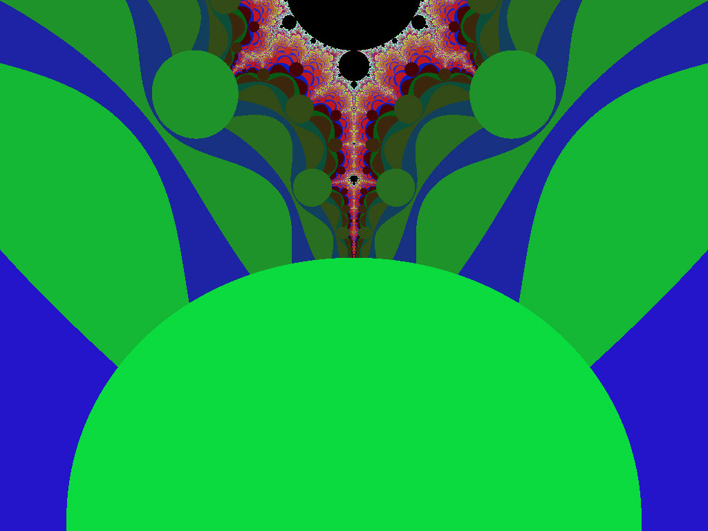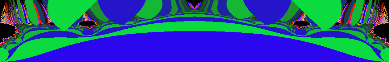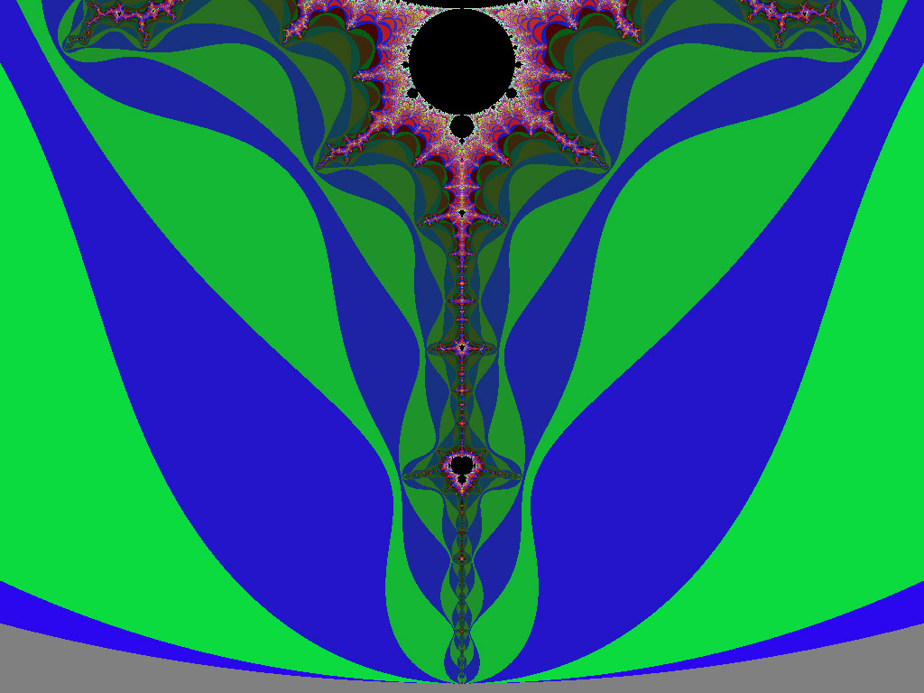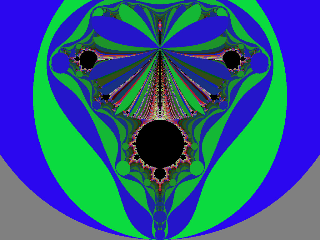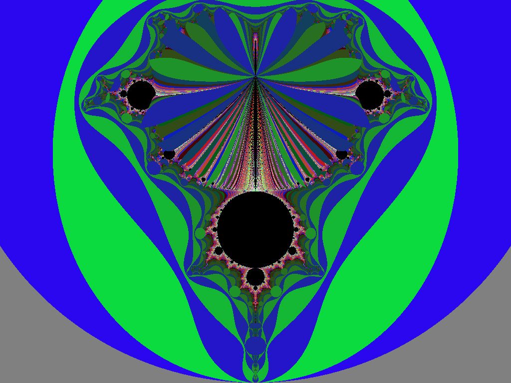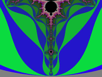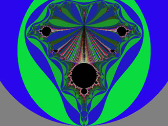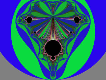This largest circular form is recessed especially far from the edge of the repeller sets out on the spike, at the extreme. The edge of the disc is flush with the edge of the Set so that it just obscures the final extent of the spike itself, and meets the repeller sets at the far end. As with the other circular objects, it is at a favorable energy level with respect to its surroundings. In other words, it requires fewer calculations and less energy to resolve, or maintain, this form than those areas of the repeller sets which it overlies, or the Set itself. It is exceptional, however, in that it completely obscures the spike, and all of the other circular forms around the periphery leave a small region of the higher-iterated areas exposed on the side away from the edge of the M-set. So; it would seem that we are cut off from some kinds of knowledge, either by nature, or by what our calculational process has revealed. Or are we?