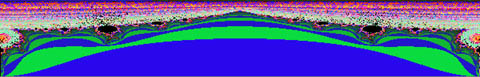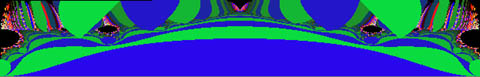 The border of a fractal is the very embodiment of the stretching of space, and the Mandelbrot Set demonstrates this quite clearly. It encloses a finite area and yet the length of the boundary is much larger than a circle of the same area. Also, it's apparent boundary grows as the size of one's measuring rod diminishes. The perimiter of the outer circle is easy to calculate, but each color band further inward is more and more convoluted, and it becomes hard to measure the perimeter exactly, very much like many natural coastlines. Although the building of form proceeds smoothly from one color band (denoting the repeller sets) to the next, in the manner of smooth waves building upon each other, the cumulative effect results in areas where the edge is folded back upon itself. It should be noted that the outer bands are forms which can be resolved in a few calculations, and they are simple shapes with relatively smooth outlines. As one proceeds inward, the shapes become more articulated, and their features require many more calculations to resolve.