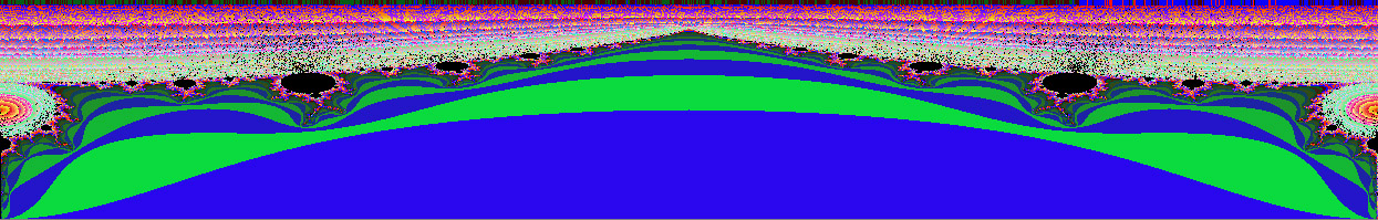 In most parts of the Set, only very tiny waves are anywhere near the edge of the figure, which lies inside all of the color bands. Near the cusp, at (0.25, 0i), the fine detail of local features requires enormous numbers of calculations to resolve, and the waves in the repeller sets (of the innermost color bands) are very tiny indeed. Near the tip, at (-2, 0i), however, all of the longer waves in the repeller sets converge, and meet up with the shorter waves. Even the color bands requiring the fewest calculations to resolve touch the Mandelbrot Set itself at the very tip. It appears as if the waves which emanate from the end nearest the cusp are being absorbed by the structures on the opposite end of the figure. In the tail, near the tip, you can find the largest of all the miniature Mandelbrot figures. If you overlay the form of the Fractal Butterfly, you find that the largest of all the circular figures is centered about this feature. This seems especially significant to me, and I will explain why later.